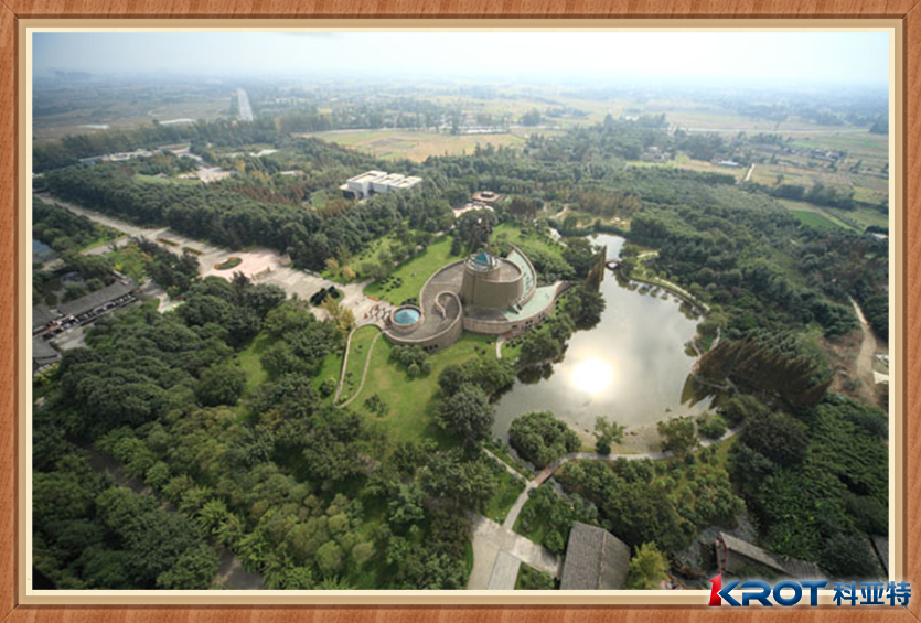 三星堆博物館占地面積約33公頃,綠化面積達80%以上,館區(qū)內(nèi)環(huán)境優(yōu)美、布局動靜得宜,曲徑敞道,垂柳依依、古蜀奇葩、湖光島影無處不體現(xiàn)了人文與自然完美結(jié)合、飄逸自然、渾然天成的川西園林特色。博物館主體建筑外形追求與地貌、史跡及文物造型藝術(shù)相結(jié)合的神韻,融原始意味和現(xiàn)代氣息為一體。一展館建筑為半弧形斜坡生態(tài)式建筑,張揚人與自然和諧共生的人文精神,二展館建筑為三部一體的變形螺旋式建筑,其整體具有“堆列三星”與“人類歷史演進歷程”的雙重象征,館外還有氣勢灰宏的仿古祭祀臺和供現(xiàn)代文體活動的大型表演場與展館建筑遙相呼應(yīng),表達了三星堆文化蒼古雄渾、博大精深的歷史意蘊。